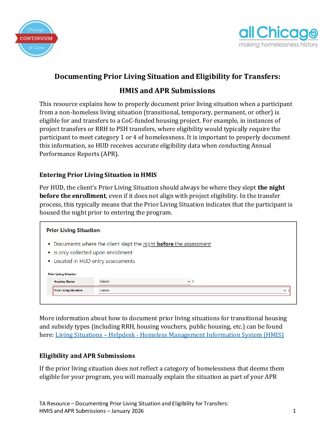 This resource explains how to properly document prior living situation when a participant from a non-homeless living situation (transitional, temporary, permanent, or other) is eligible for and transfers to a CoC-funded housing project.