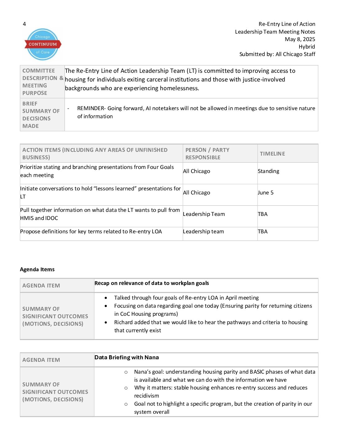 Home > Continuum of Care Meeting Files > CoC Implementation Structure > Re-Entry Line of Action > Re-entry LOA LT 2025 > Re-entry LOA LT 05.08.25 > Re-Entry Line of Action Leadership Team Meeting 5.8.25 Meeting Notes